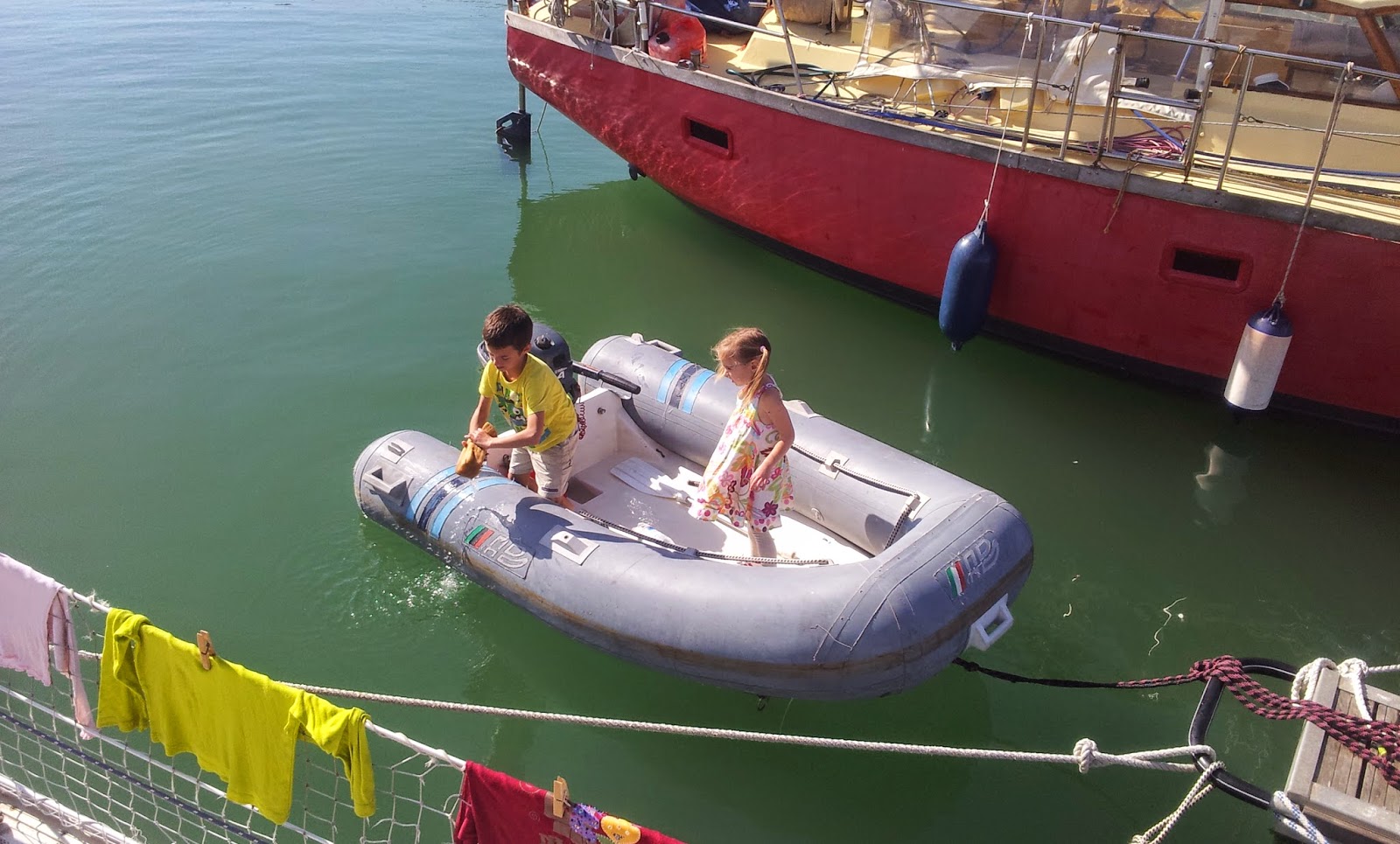 A délelőtt a sorok igazításának ideje: Tomi hajót szerel, a beázásokat próbálja megszüntetni, én mosok, a gyerekek kalózosat játszanak a bociban, Marci vezényletével, teljes komolysággal – mintegy két órán keresztül.